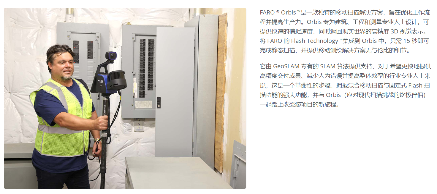 FARO ® Orbis ™是一款独特的移动扫描解决方案,旨在优化工作流程并提高生产力。Orbis 专为建筑、工程和测量专业人士设计,可提供快速的捕捉速度,同时返回现实世界的高精度 3D 视觉表示。