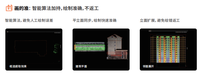更全面的绘图支持功能是CoProcess 2025的另一大亮点。其点云叠加模型显示功能支持叠加同一区域的建筑点云数据与倾斜模型数据,有效解决了建筑遮挡导致的数据缺失问题,数据同屏显示让建筑立面完整无缺,方便用户绘图。深度渲染功能可刷新模型“画质”,清晰区分窗框、暗色墙面间的边界特征,用户点击即可一键快速切换,无需长时间等待加载,让边界绘制更加轻松果断。邻面实时参照功能支持相邻立面同时展现,用户点击邻面展开后,两侧立面自动显示,便于相互参照绘制,保证面面对齐、严丝合缝,减少了因立面错位导致的反复修改工作量,提升了绘图效率。快速切片功能支持切片绘制随画随切,用户在绘制平立面外轮廓时,可根据项目数据完整度随时挑选合适位置的切面进行绘制,无需反复导出再调整,实现了切片的智能选择。